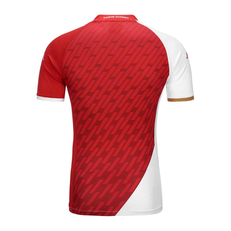 La camiseta está fabricada con materiales de última tecnología, lo que garantiza un alto rendimiento en el campo. Su sistema avanzado de absorción de humedad mantiene a los jugadores frescos y secos durante el partido, mientras que el tejido ligero proporciona una comodidad excepcional. El escudo del AS Mónaco se ubica con orgullo en el pecho, mientras que el logo del patrocinador se integra de manera armónica en el diseño, manteniendo una estética equilibrada y moderna.