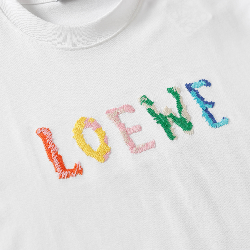 Loewe, bajo la dirección creativa de Jonathan Anderson, aporta una sensibilidad artesanal a cada prenda, lo que se refleja en detalles refinados como costuras perfectamente acabadas, etiquetas bordadas, y técnicas de impresión o bordado de altísima precisión.